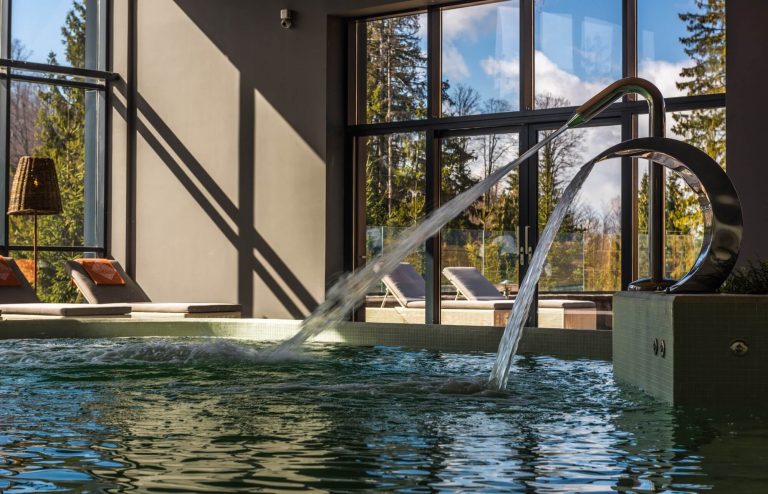 The spa has at least one swimming pool - indoor or outdoor and a selection of other wellness facilities, e.g. whirlpool, other types of pools, saunas, ice fountain, salt room, Tepidarium, Zen Garden etc